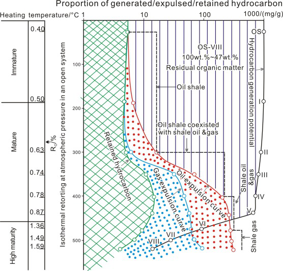 在该项研究中,课题组利用油页岩常规干馏系统,设置8个不同加温和恒温阶段,对加热产物和残留物进行有机地球化学、有机岩石学等分析。测试数据显示,在开发系统快速加热背景下,加热温度低于300℃,产物主要为水,油页岩具有极高的生烃潜力,有机质处于未熟-低熟阶段;300-475℃加热温度可产生大量的油气,有机质丰度及生烃潜力快速下降,加热的油页岩中含有大量的残留烃,有机质处于人工加热“生油窗”;加热温度为475-520℃,只产生少量气体,有机质处于高熟-过熟阶段,几乎没有生烃潜力。整个实验过程,近50%有机质(98%的生烃潜力)转化为油气,剩余大量的滞留碳,并建议油页岩原位转化的最终温度应为440℃左右。本次正演的有机质生烃和热演化规律,不仅可以有效的指导现场油页岩原位开采,同时还可以对大型盆地页岩油气等非常规能源矿产成藏序列进行反推。