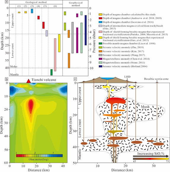 通过多次联合野外地质考察,厘定了长白山破火山口阶段火山喷发序列。即长白山破火山口阶段喷发主要由天文峰期(TWF)、千年大喷发第一期(ME-I)、千年大喷发第二期(ME-II)等三次中等-大规模普林尼式喷发构成(图1)。在野外地质研究基础上,利用包裹体温压计和矿物温压计估算岩浆驻留深度,结合地震、大地电磁成像,提出长白山破火山口阶段存在由浅部岩浆房(埋深0.5-3 km)、中地壳岩浆房(埋深10-15 km)和壳幔边界残留基性岩浆房(40 km左右)构成的复合岩浆房系统(图2)。进一步根据主微量元素和Sr-Nd同位素分析结果,区分出三条岩浆演化路径。结合岩石学、矿物学分析,认为天文峰期和千年大喷发第一期的碱流质浮岩喷发由浅部岩浆房系统控制,中地壳岩浆房起到了岩浆补给站的作用,即浅部岩浆房中碱流质岩浆均继承自中地壳岩浆房中造锥期残留的粗面质岩浆,为粗面质岩浆向碱流质岩浆演化后,上升并注入到浅部岩浆房逐渐聚集形成。而千年大喷发第二期粗面质浮岩则直接来自破火山口阶段中地壳岩浆房中新注入的粗面质岩浆。