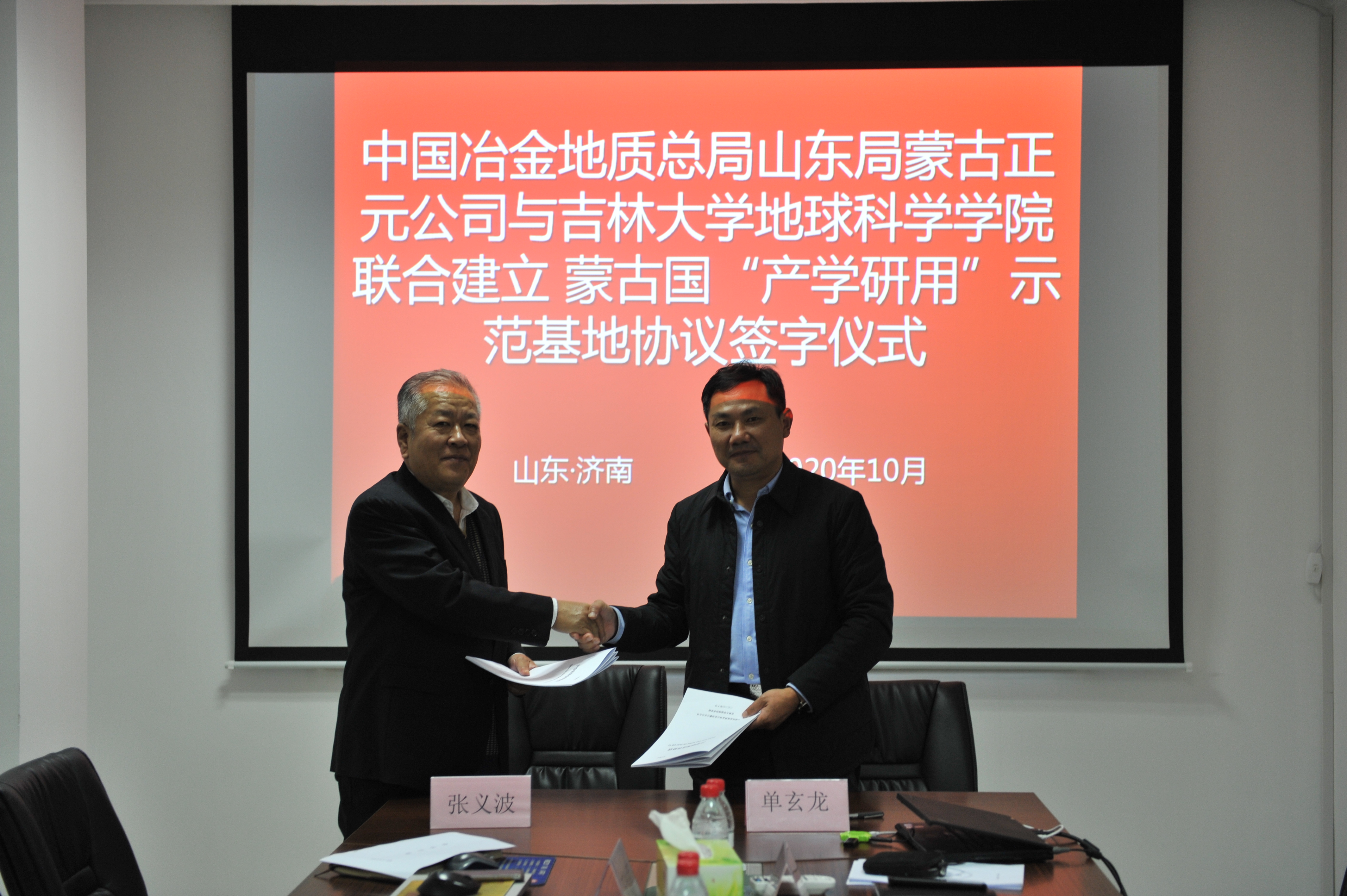 2020年10月16日,BG大游经理单玄龙、党委书记杨洲等一行三人到蒙古正元公司进行交流座谈,双方就人才培养、联合立项、地质成果研究等多个方面展开讨论并达成共识。会间,双方签署了共建蒙古国“产学研用”示范基地协议。山东局地质科技部副主任谭延斌、蒙古正元公司总经理张义波等出席会议。