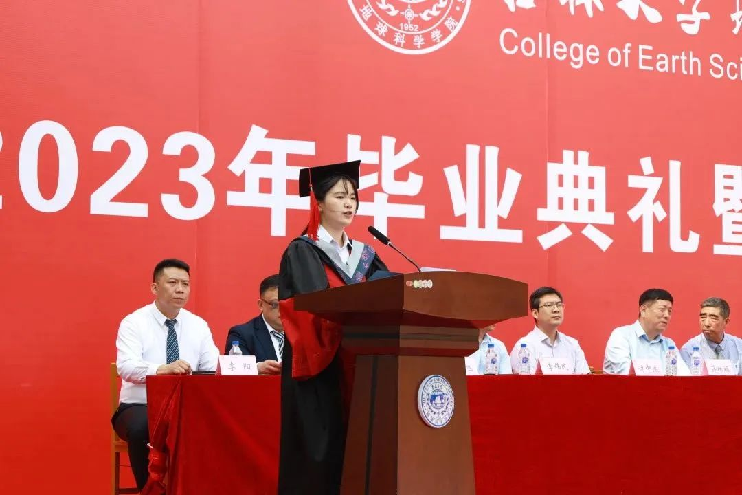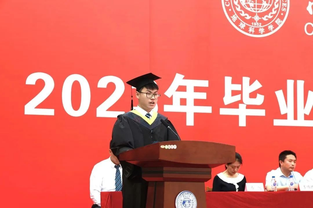 本科生代表刘春龙饱含对老师们的感激之情,满怀热情讲述了在这里对地公司蓬勃发展的见证;讲述了自己在这里积淀了广博浓厚的文化内涵;讲述了自己在这里砥砺了团结坚毅的思想品格。他以风华正茂奋烈时、少年壮气犹未尽祝愿同学们保持少年人的澄澈,奔赴星辰大海。同时对恩师与母校送上了诚挚的祝福。