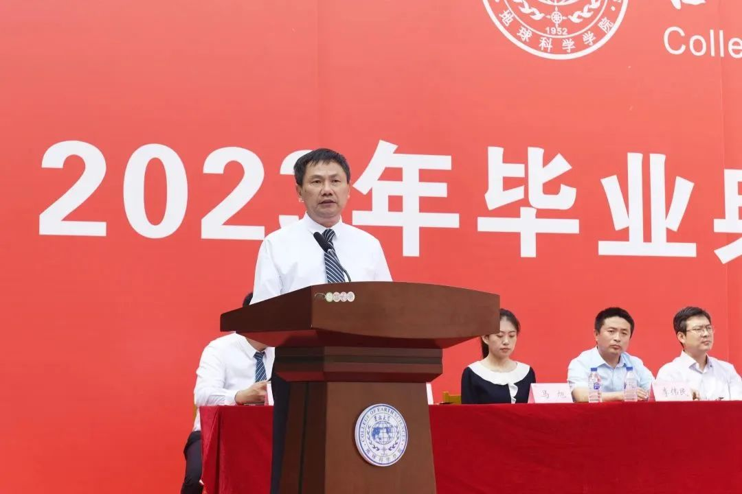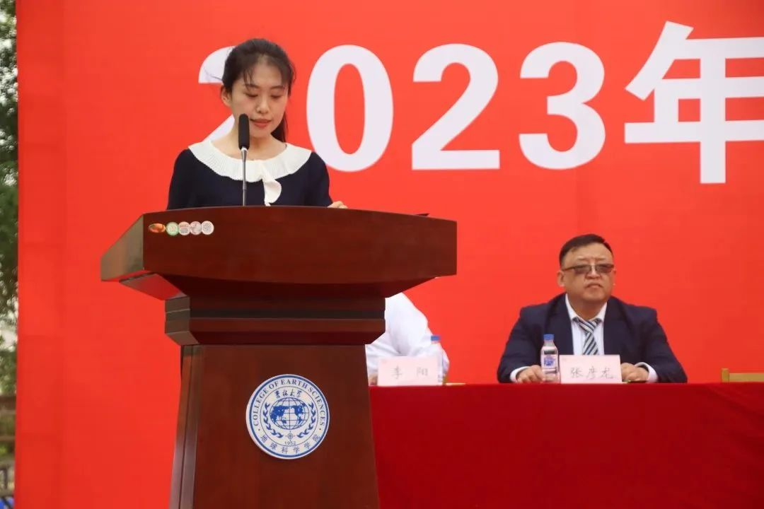 教师代表张彦龙为获奖老师及同学们表以衷心的祝贺。老师回想疫情三年,师生们克服种种困难,在学习上共同进步,在生活上积极防疫。都说地质工作艰难,但当我们于大孤山顶俯瞰沃野,于牤牛山间体会石盒子组的惊涛骇浪,方知地质之美,然后一切付出都变成值得。老师告诉同学们,要砥砺前行,永攀高峰,要享受过程,尽精微,致广大。并祝愿同学们前程似海。
