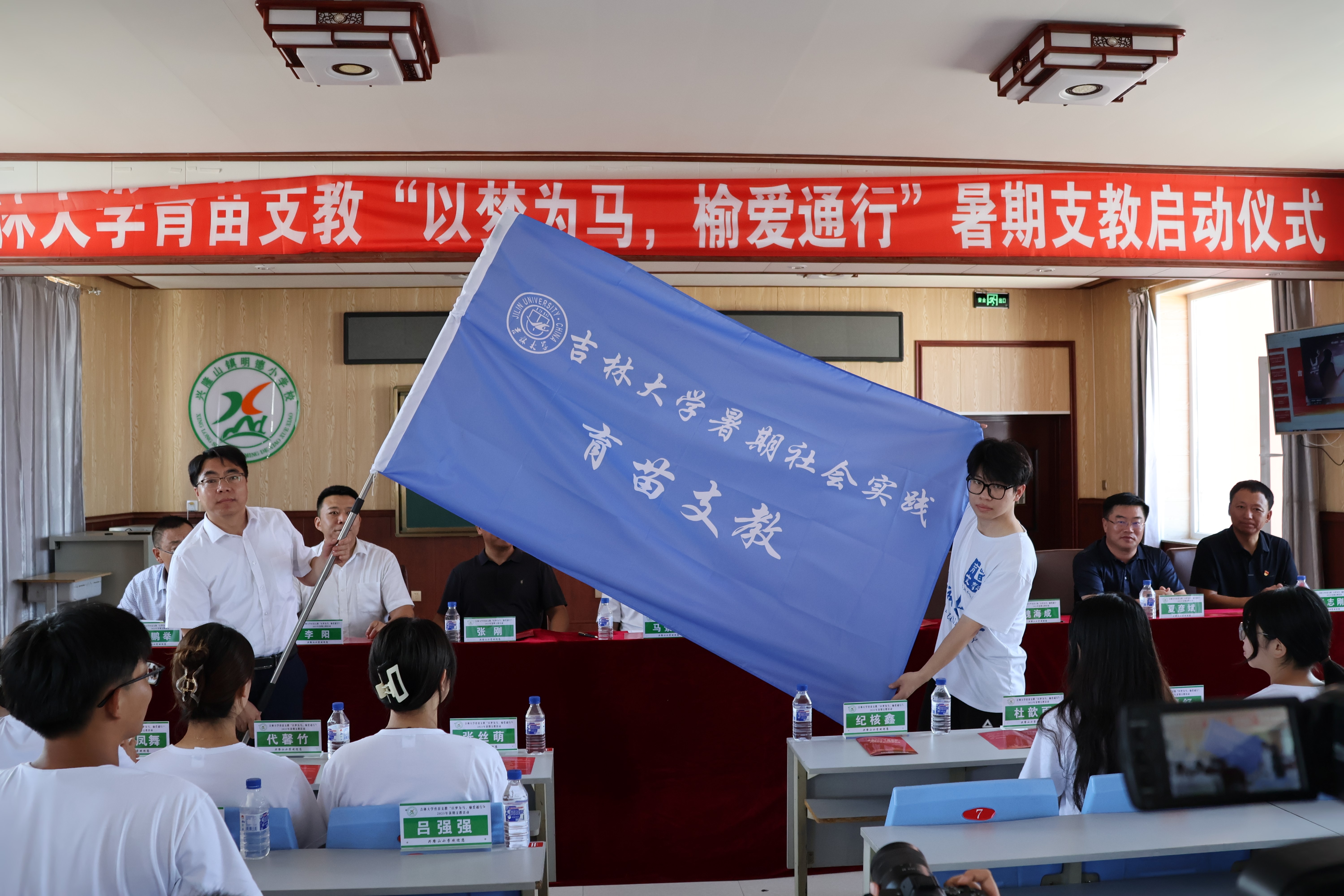 魏海成副书记向支教队队长吕强强进行“BG大游官方网站育苗支教社团暑期社会实践”授旗