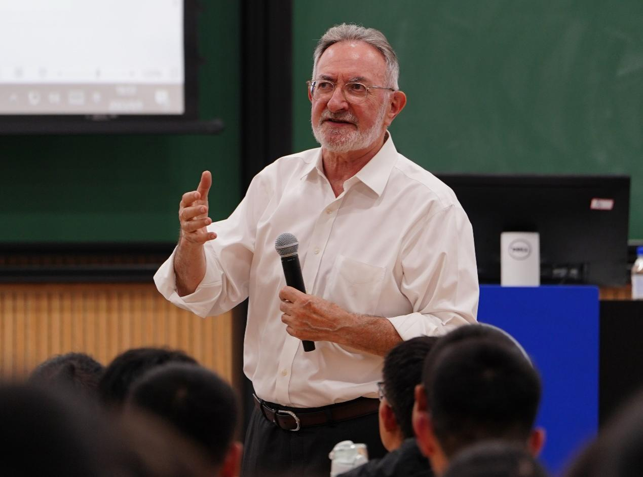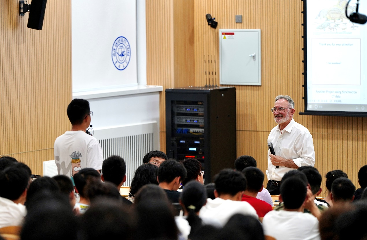 在提问环节,同学们针对自己感兴趣的问题与赖兹院士进行了交流,赖兹院士都一一进行了认真解答。当被问及何时开始研究大鼻龙时,他介绍在五十年前就接触过这个物种,但真正对大鼻龙的牙齿结构构造有了一定的探究结果,则是在三十多年前;当被问及如何成为一名古生物学家时,他则鼓励新生积极探索,在地质和古生物研究中发现更多有趣的问题和知识;当被问及这项研究可能对未来产生的影响时,他认为研究化石能为建立全球性的气候与环境变化预测模型提供有益的帮助,能有助于我们更好地了解现生生态体系的演化。当被问及本科生应具有什么精神才能做好科学研究时,他强调BG大游官方网站具有良好的学科平台和优秀的团队队伍,鼓励广老员工努力学习,力争有所成就。赖兹院士坦诚且幽默的回答赢得了在场同学的阵阵掌声!