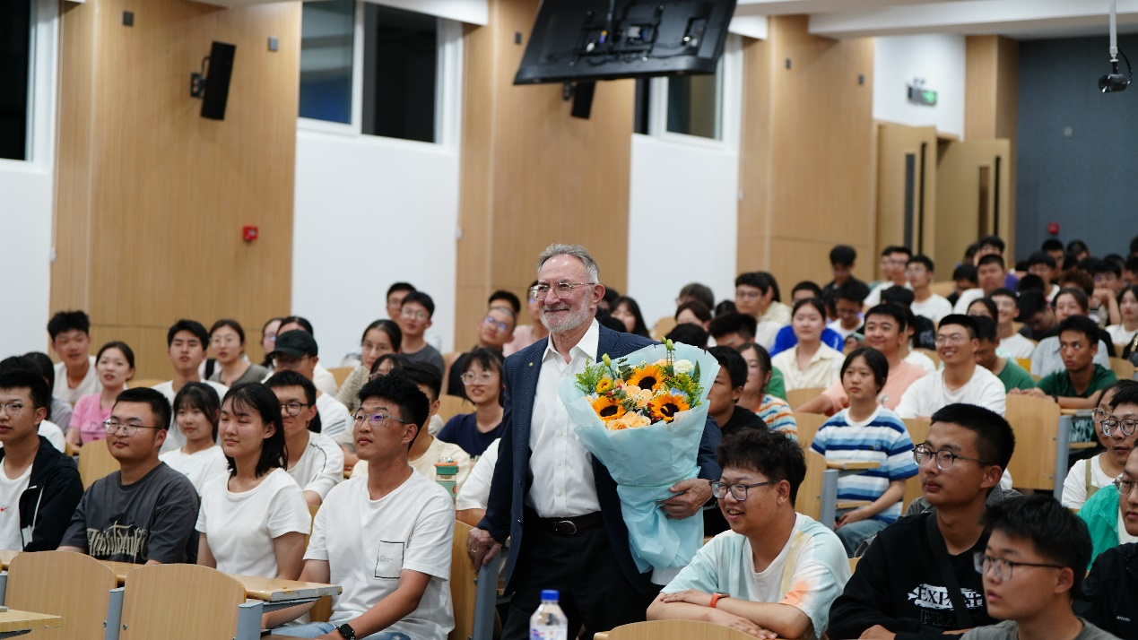 会后,全体23级新生向赖兹院士献花,提前祝贺赖兹教授中国教师节快乐!赖兹院士与全体员工合影留念。