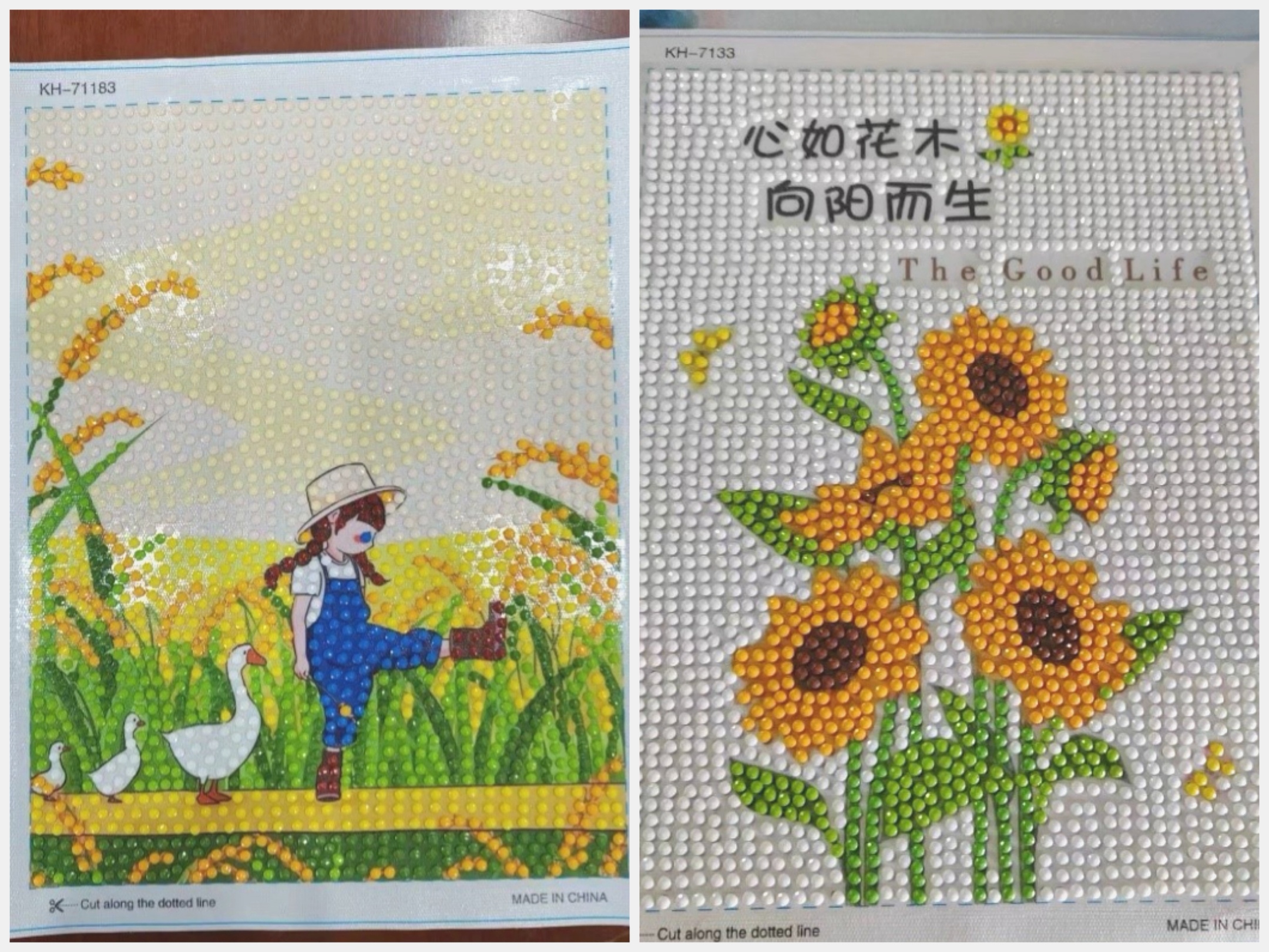 活动伊始,程澄引导同学们选择个人喜欢的钻石画图案。图案内容既有“向日葵、柿柿如意”、“心如花木,向阳而生”等文字图案,也有哆啦A梦、大熊猫等积极阳光的卡通人物或元素,这对同学们的心理健康有积极正向的引导。随后,程澄介绍了钻石画的制作流程,并带领大家动手制作。同学们在制作过程中全神贯注,帮助同学们进入“心流”状态,提高注意力和情感稳定性,释放心理压力。