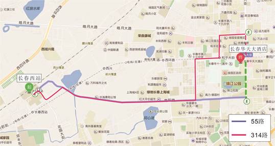 (3)长春西站乘坐314路(长春西站-般若寺)途径8站到达春城大街,步行743米到达长春华天大酒店(全程约8.5km,约55分钟,1.00元)。