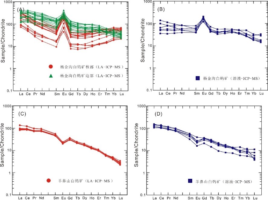 图1 杨金沟、羊鼻山矿区白钨矿稀土元素球粒陨石标准化配分型式图