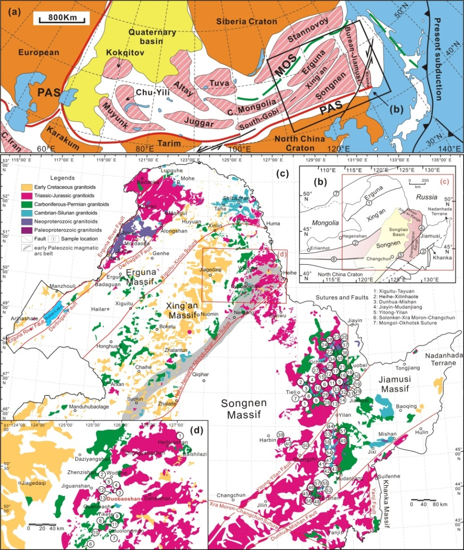 针对上述问题,BG大游许文良教授团队的博士研究生龙欣雨和唐杰副教授(通讯作者)等人,对中亚造山带东段的松嫩地块和多宝山岛弧地体上广泛分布的花岗质岩石(图1)开展了系统的锆石U-Pb年代学、全岩地球化学和锆石Hf同位素研究,利用花岗岩的结晶年龄和模式年龄,建立了中亚造山带东段的地壳生长模型。取得了以下主要认识: