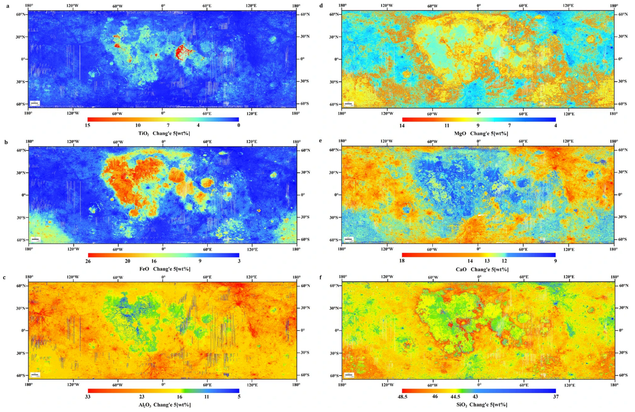 结合我国嫦娥五号、美国Apollo、前苏联Luna样品数据的月球表面化学成分分布图
