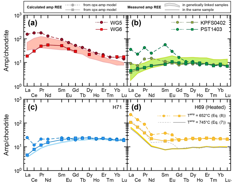2. 利用以上模型,可以通过角闪石和辉石的主量元素和REE成分反演角闪石的结晶温度(图1)。与已有的角闪石温度计相比,该REE温度计可以更好地表征含水熔体交代岩石圈地幔的温度。