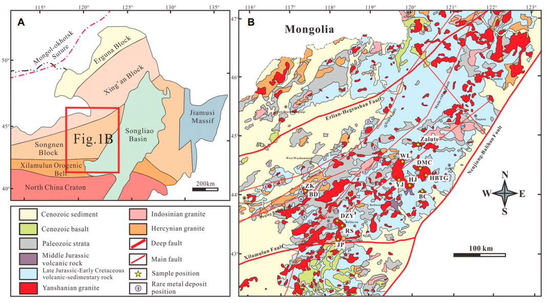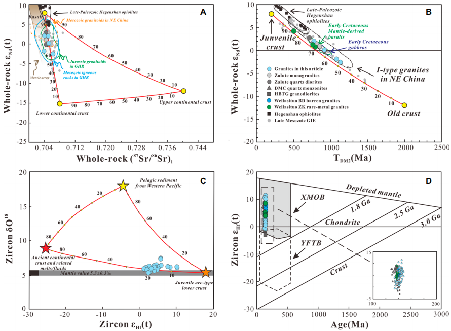 高分异花岗岩作为大陆地壳成熟度的标志,其源区和成因蕴含着探索大陆地壳生长、岩石圈演化及区域构造发展等重要信息,此外,高分异花岗岩具有成矿专属性,往往与稀有金属矿产密切相关。然而,控制花岗岩高度分异和稀有金属矿化的机制尚不清楚。针对以上问题,BG大游官方网站葛文春教授科研团队选取大兴安岭南段早白垩世贫矿高分异花岗岩开展锆石微量和U-Pb-O-Hf同位素、全岩主微量和Sr-Nd-Pb同位素的分析测试(图1),并与周围同期花岗岩堆晶体和稀有金属花岗岩进行综合对比,揭示了高分异花岗质岩浆形成和演化的过程,并探讨了影响高分异花岗岩稀有金属矿化的关键因素。具体研究成果如下: