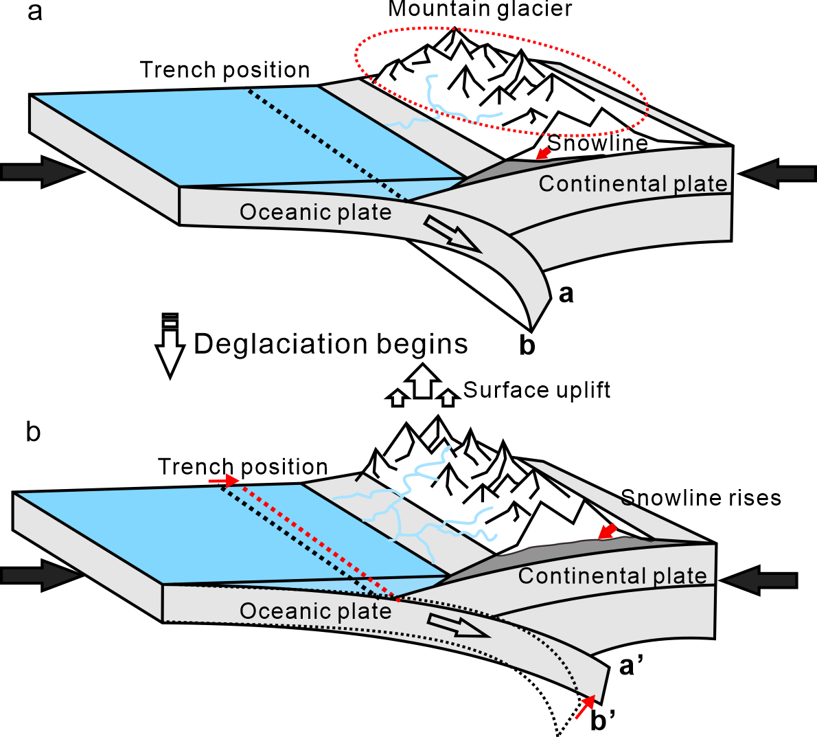3.提出了冰川消融影响板块俯冲的完整机制:提出了冰川消融影响板块俯冲的完整机制:冰川消融通过改变岩石圈应力场和均衡调整,直接或间接调控俯冲板片角度、海沟迁移及隆升速率。这一过程在冰川厚度较大时尤为显著,为理解气候-构造相互作用提供了量化依据(图5)。