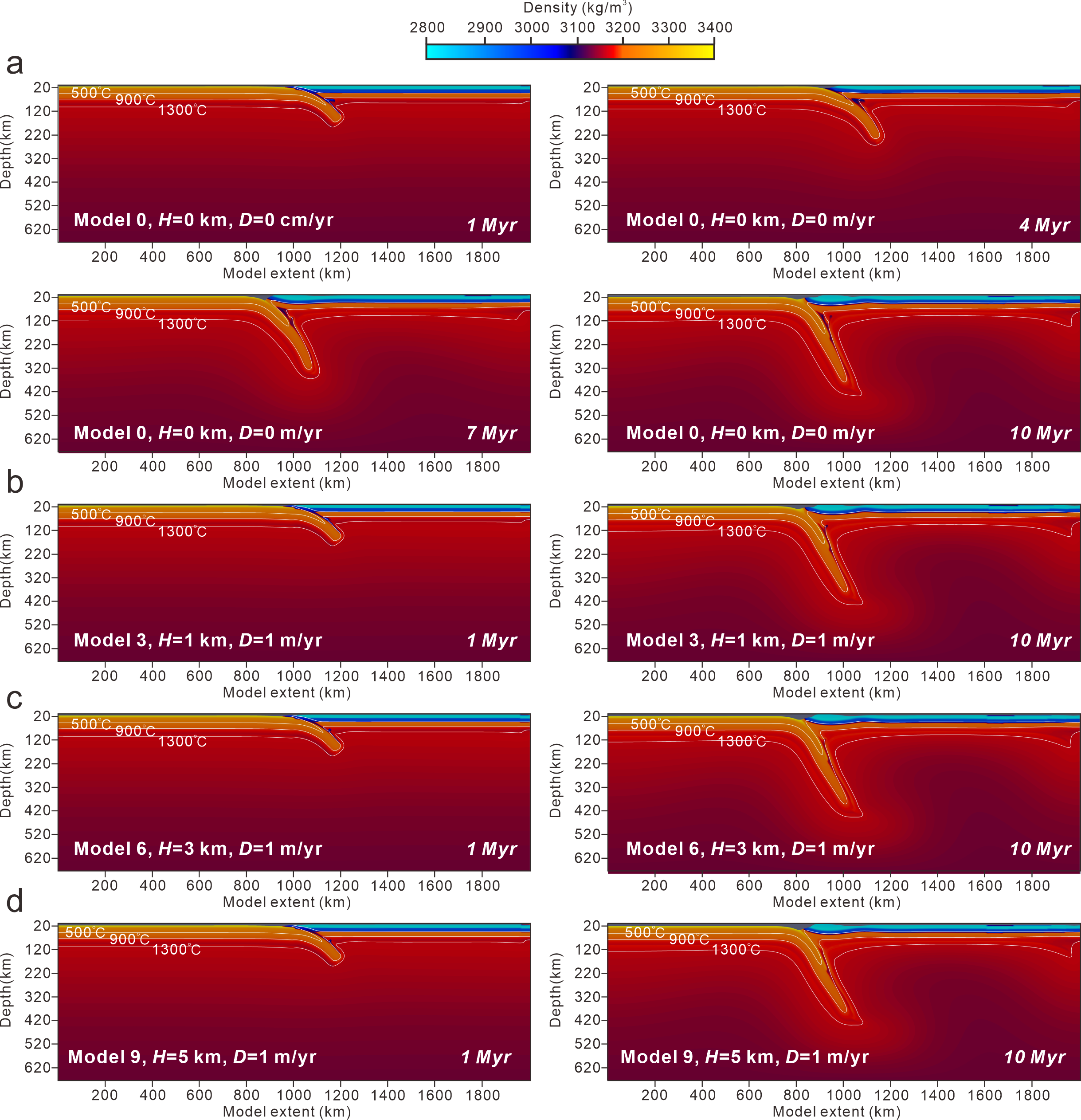 图2 未施加冰川的模型0和冰川快速消融组(模型3,6,9,对应融化速度1 m/yr,冰川高度1,3,5 km)的板块俯冲形态演化图