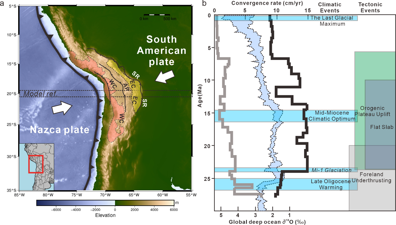 图1(a)根据Pons等人(2022)修改的中部安第斯山脉结构图;(b)气候构造响应时间图