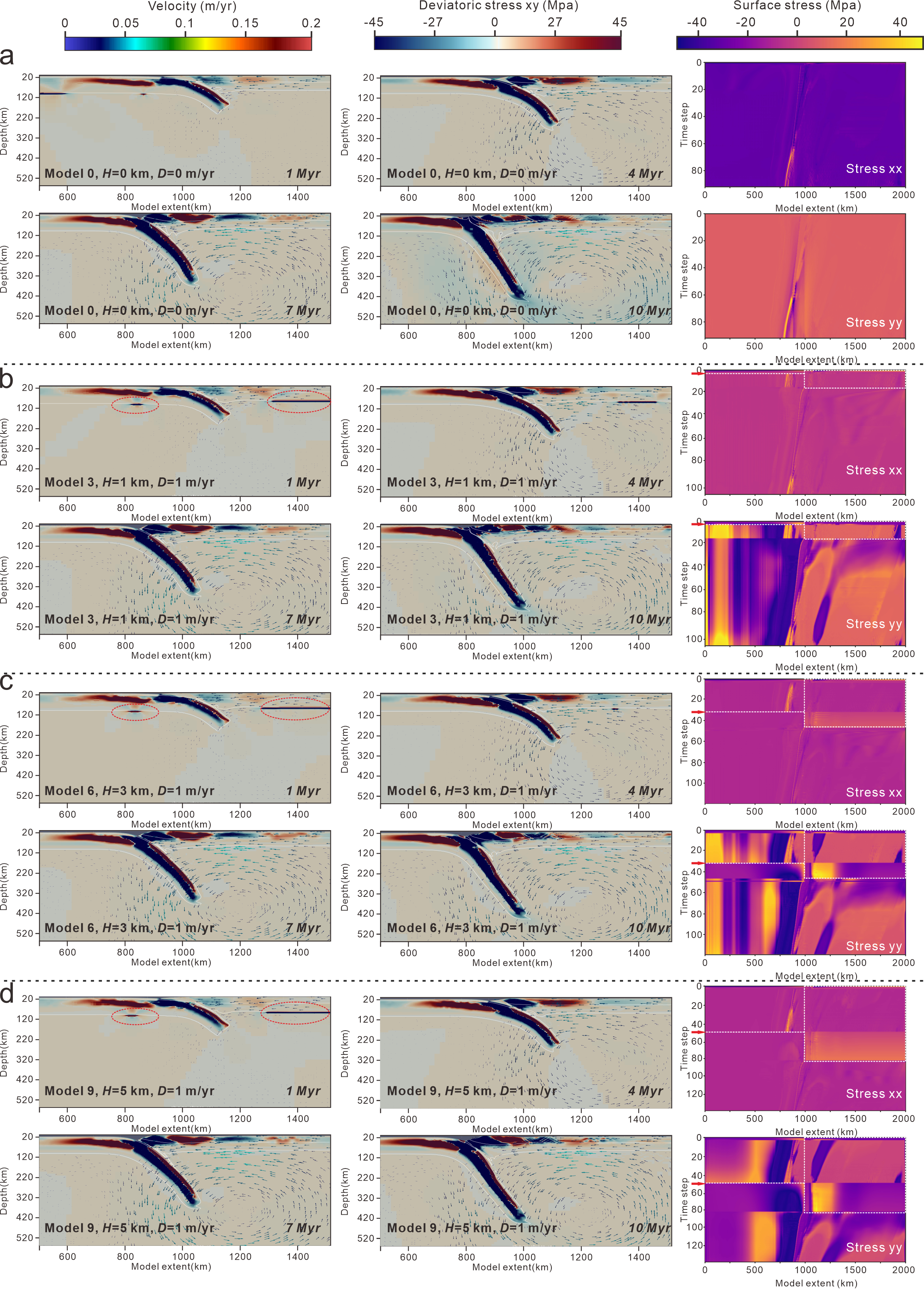 图3 未施加冰川的模型0和冰川快速消融组的板块俯冲偏应力σxy和速度场图(左)和表面应力σxx和σyy图