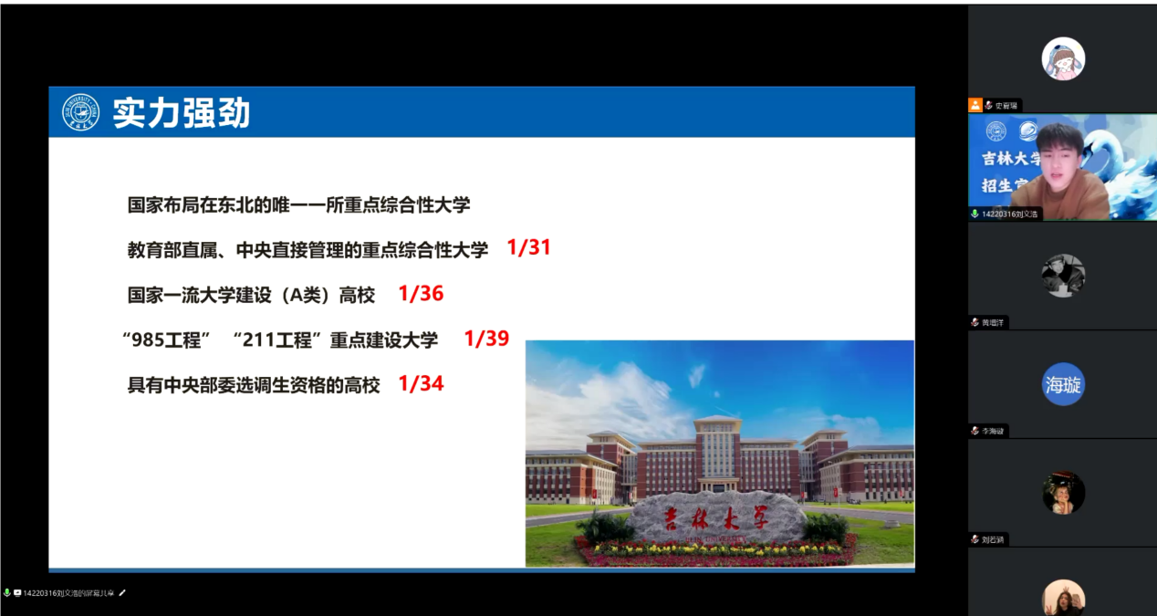 本次线上宣讲共吸引100余名乐陵一中高二同学以及家长踊跃参与,宣讲主要围绕着BG大游官方网站的强劲实力、深厚底蕴、杰出人才、卓越专业、人才培养的巨大优势、基础学科的拔尖培养计划、“强基计划”、全球唯一一个古文字学、综合开放创新的人才培养环境、开放包容的转专业环境、国际交流与合作的平台优势、BG大游官方网站学子未来深造和就业的美好前景,BG大游官方网站学习生活的优美环境,学习的优渥条件,丰富美味的食堂,方便安全的出行,设施完备的娱乐活动和丰富有趣的校园活动等方面展开介绍。