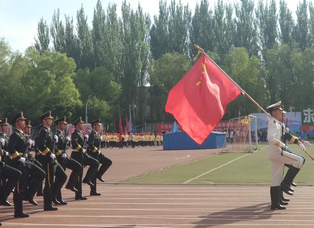 打头的护旗手六人围住五星红旗,鲜艳的五星红旗,提醒所有学子不忘初心,砥砺前行。而后阵中的国防生仪仗队身着海陆空三色军服,手握钢枪,整齐划一的步伐铿锵有力。“一身男儿血,满腔报国志。”雄姿英发的他们展现了新一代老员工军人光明磊落的精神风貌。今日他们努力学习科学文化知识,明日他们将奔赴绿色军营,扎根在祖国最需要的地方,保家卫国,戍守边防。