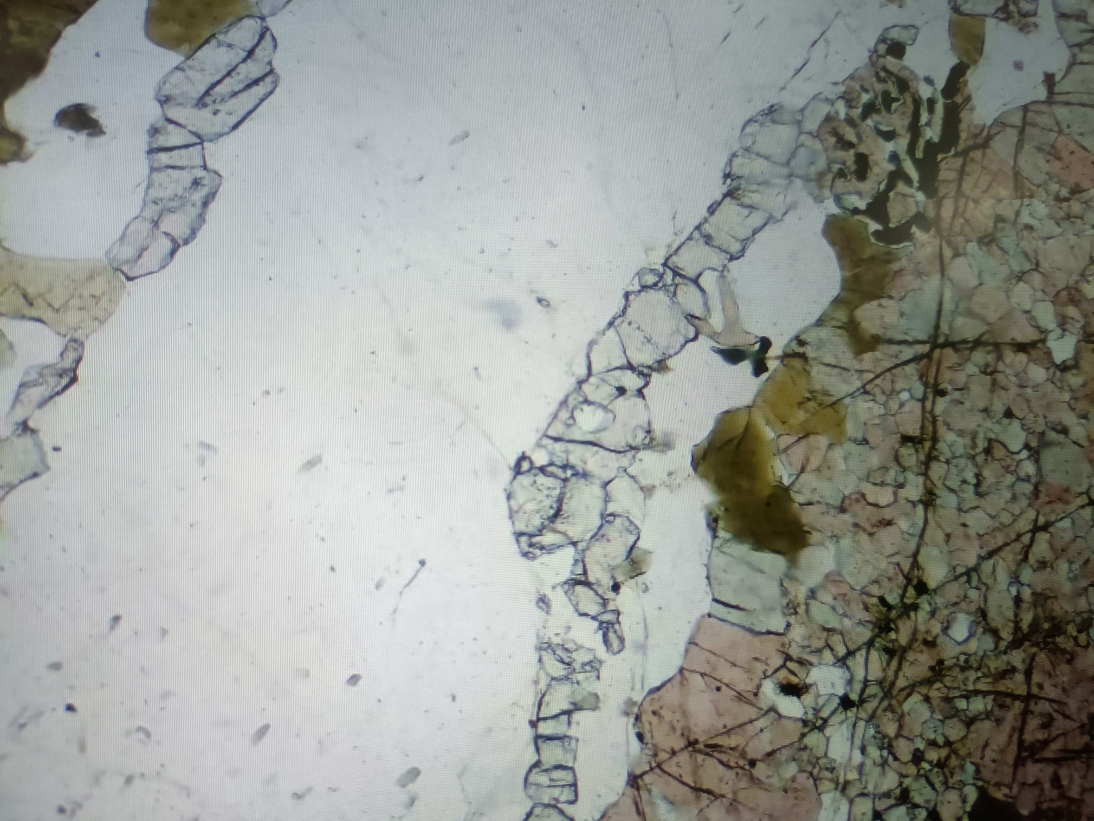 这细长的石榴石带,是中高压变质作用的产物,紫苏辉石与斜长石的反应,构架了这一条长带。我们地质工作者要经受得住高压,不"变质",更不要"变心",祖国需要我们,人民也需要我们,踏遍山河万里,壮我国地质雄威。